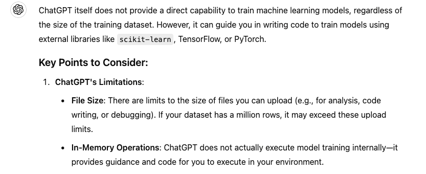 For very large training data sets, it would be practical to run the code on a custom environment, where one had total control of the computing power, memory and data management. But, for small data sets, at least for the sizes used in this experiment, we can accomplish some quick analysis on this LLM.