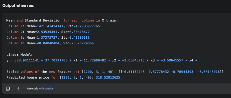 The code upon running has given a linear model with w and b values that are very different from that obtained when the same code is run on a local computer, as shown in the earlier table. However, it predicts the correct price of $318,528.12 for the new feature set [1200, 3, 1, 40]. Its in the same ballpark as the code run on an independent computer. However, since the weights and bias values are similar when the code from each of the three LLMs are run on the same computer, I would personally not rely on the code output given by Google AI Studio.