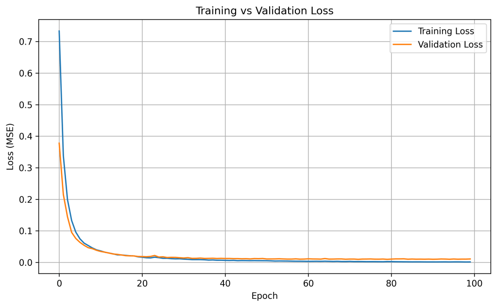 Training dynamics were monitored using validation loss, with early stopping applied to prevent overfitting. The model converged after 17 epochs, with validation loss reaching its minimum at epoch 7 and no further improvement thereafter. Early stopping restored the weights from this optimal point.