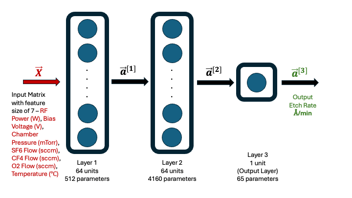Figure 1.Architecture of the 64-64-1 neural network used to predict CMOS process cost from 20 input features. The model consists of two hidden layers with ReLU activation and a single linear output node. Standardization was applied to all features and the output using scikit-learn.